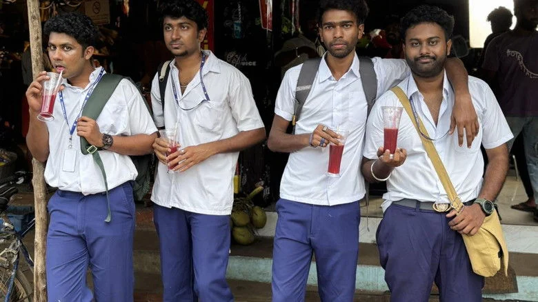 The first half unfolds almost entirely within school grounds, and this constraint works in the film’s favor. New Indian Express rated it 3/5, noting that “the first half, set largely within the school space, is easily the film’s most engaging stretch.” The confined geography forces a specificity that later sections abandon entirely. Within classrooms and hallways, the four friends, Hashir, Alan, Ajin, and Vinayak, feel grounded, their frustrations legible because the world pressing down on them is tactile and recognizable.